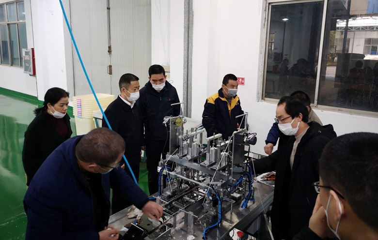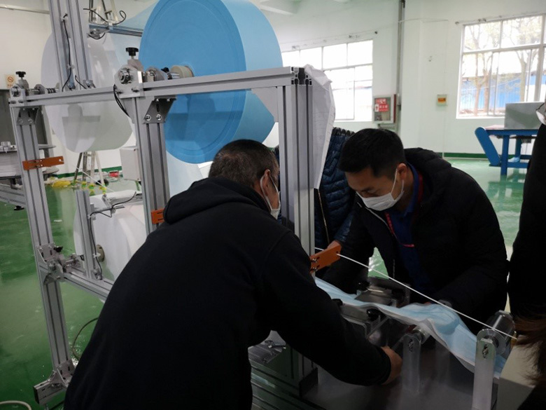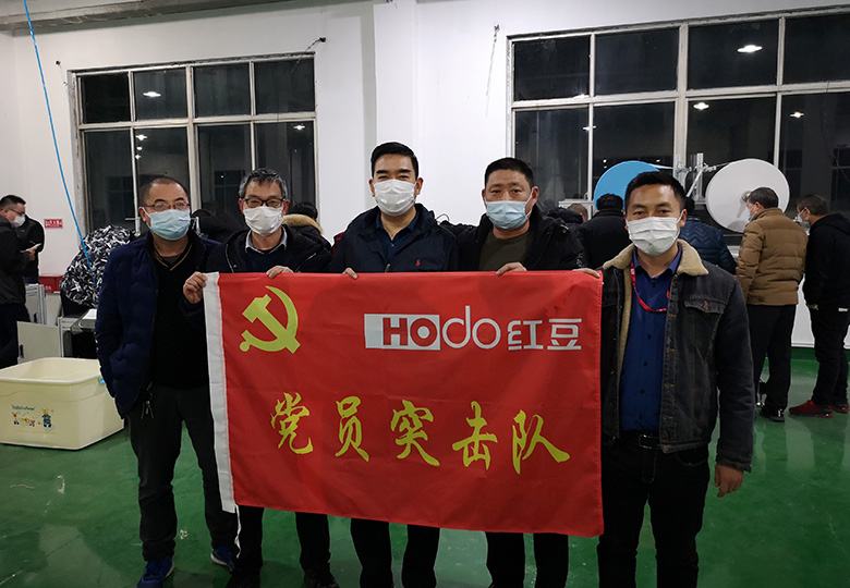 今天隨著兩套全自動口罩生產設備運到工廠,紅豆又將新添兩條口罩生產流水線。紅豆口罩黨員突擊隊一馬當先,在隊長馮振標帶領下,一呼百應,董建剛、戴宏、田勇、蔣國敏等黨員干部沖在前,犧牲周末休息時間,加班加點連夜安裝調試口罩生產流水線設備。