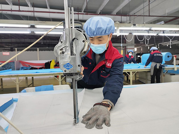 “沒有現成的提拉工具,就想其他辦法。先用鏟車把面料運到指定區域,為提高效率,我們用2個板凳自制了工具,順利將面料快速送上裁剪臺?!卞X學民笑著說。