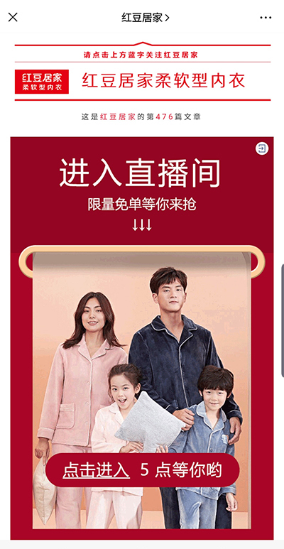 疫情來襲,“宅”成為大部分人的生活常態(tài),“紅粉”有了更多時(shí)間觀看直播,也積攢了大量消費(fèi)需求。在紅豆居家的官方微信公眾號(hào)后臺(tái),500萬紅粉熱情詢問是否有睡衣活動(dòng)。在這場宅家戰(zhàn)疫中,居家睡衣或成最大剛需。2月4日紅豆居家上線“微商城”小程序。2月7日,紅豆居家推出限時(shí)閃購睡衣專場的“你需要的宅家睡衣,免郵送貨上門”,吸引25萬觀眾觀看。2月13日,紅豆居家又推出“6000萬優(yōu)惠券免費(fèi)搶”主題直播,用分享給好友助力邀請的方式引流吸粉。基于紅豆居家的大流量,騰訊公司主動(dòng)開放內(nèi)部直播名額。2月21日,紅豆居家首次上線騰訊直播,由紅豆居家品牌文化部負(fù)責(zé)人張浩和產(chǎn)品設(shè)計(jì)負(fù)責(zé)人程莉擔(dān)任主播進(jìn)行趣味互動(dòng)、介紹,共吸引5.9萬次人氣,新增訂閱人數(shù)1489人,點(diǎn)贊數(shù)達(dá)到7.6萬多人次,直播2小時(shí)期間銷售近15萬元。
