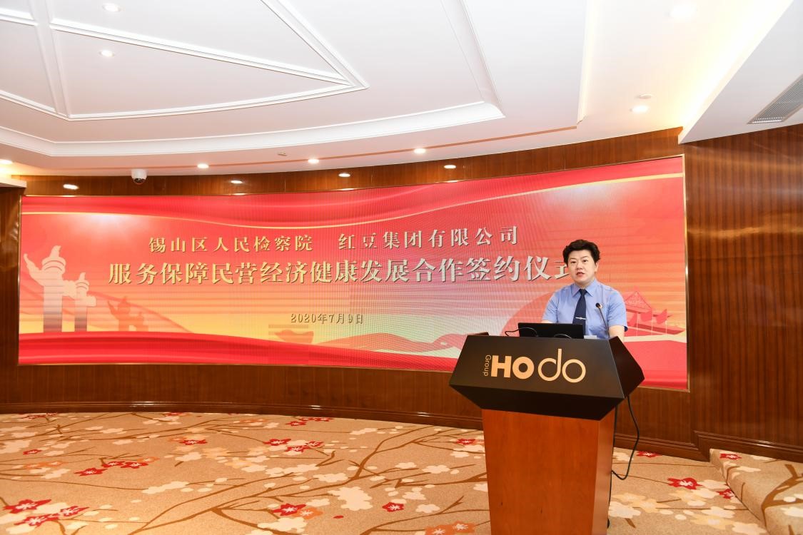 為深入貫徹習(xí)近平總書記在民營企業(yè)座談會上的重要講話精神,落實(shí)中央、省市委關(guān)于大力支持民營經(jīng)濟(jì)發(fā)展部署要求,充分發(fā)揮檢察機(jī)關(guān)職能,為民營經(jīng)濟(jì)提供優(yōu)質(zhì)的法律服務(wù)和堅(jiān)定的司法保障,7月9日,紅豆集團(tuán)與錫山區(qū)人民檢察院在紅豆財(cái)富廣場北京廳進(jìn)行服務(wù)保障民營企業(yè)健康發(fā)展合作備忘錄簽約。儀式上,紅豆集團(tuán)黨委書記、董事局主席兼CEO周海江和錫山區(qū)人民檢察院何瑩檢察長代表雙方簽署合約。