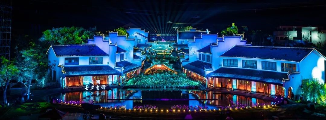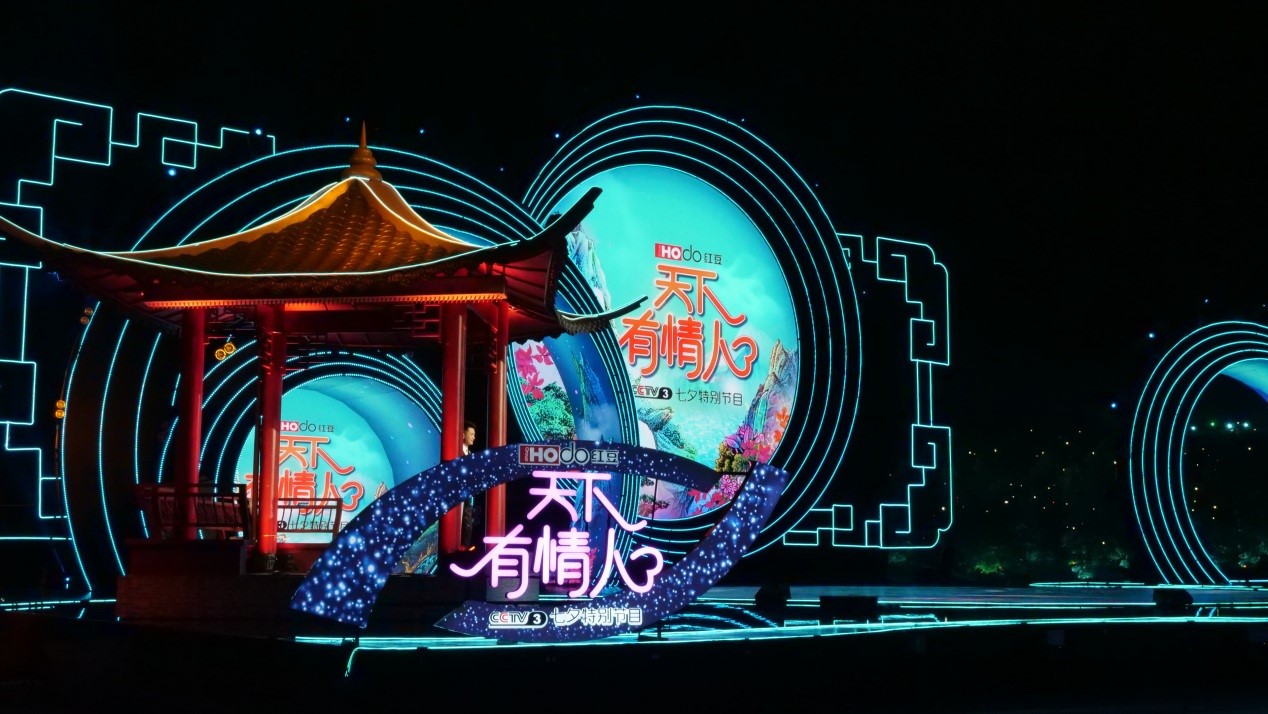 2019年,央視七夕晚會(huì)主舞臺(tái)再次回歸仙女湖,以“三大篇章”描繪“七彩七夕”,將傳統(tǒng)節(jié)日民俗與當(dāng)下流行的七夕文化相結(jié)合,展示人們對(duì)美好愛(ài)情、幸福生活的向往與追求。晚會(huì)在舞臺(tái)視覺(jué)上依然保持高水準(zhǔn),主舞臺(tái)鄰水而建,水面倒影與舞臺(tái)大屏相映成輝,水天一色的美景中盡顯古典風(fēng)韻。