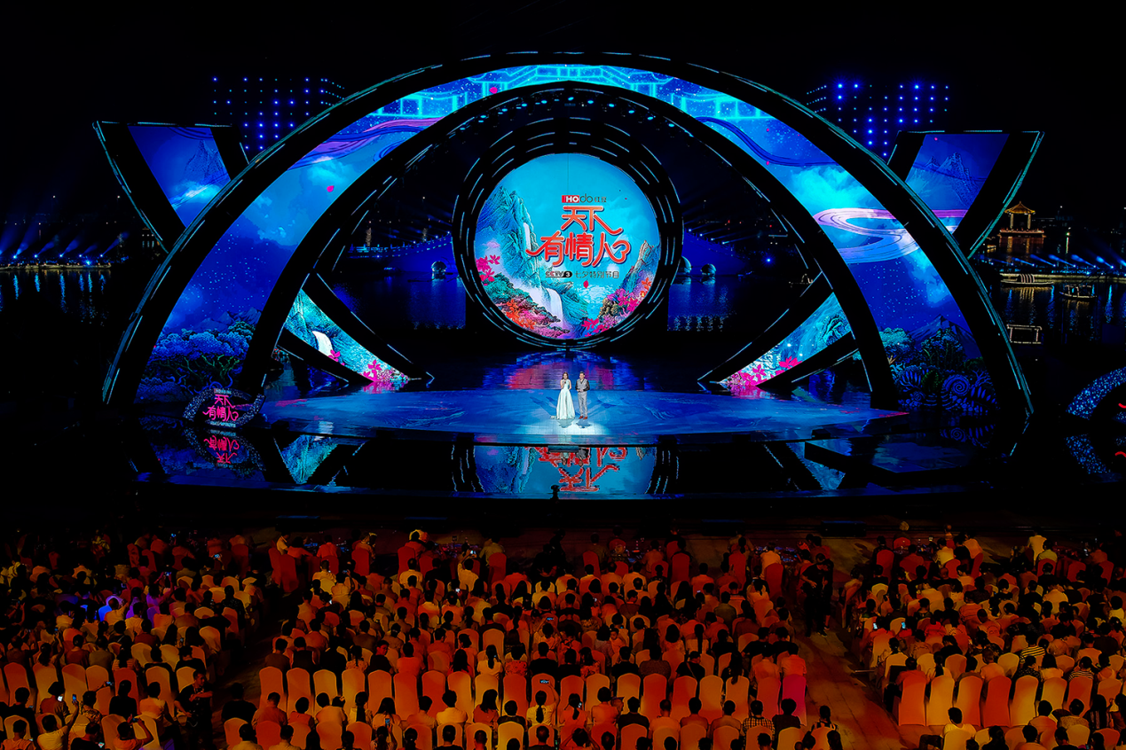 2017年,《天下有情人》七夕晚會(huì)首次從室內(nèi)來(lái)到戶外,舞臺(tái)設(shè)在了江西新余仙女湖,這里是東晉古籍《搜神記》中“七仙女下凡”傳說(shuō)和“中國(guó)七夕情人節(jié)”的發(fā)源地。在那場(chǎng)堪稱視覺(jué)盛宴的晚會(huì)上,大型實(shí)景舞臺(tái),加上酷炫的現(xiàn)代舞臺(tái)技術(shù),形成了亦真亦幻的仙境效果,讓人為之驚嘆,晚會(huì)極具古典氣息的舞美設(shè)計(jì)與豐富的舞臺(tái)視覺(jué)效果,真正呈現(xiàn)出了一幅極具中國(guó)傳統(tǒng)唯美浪漫情懷的畫卷。