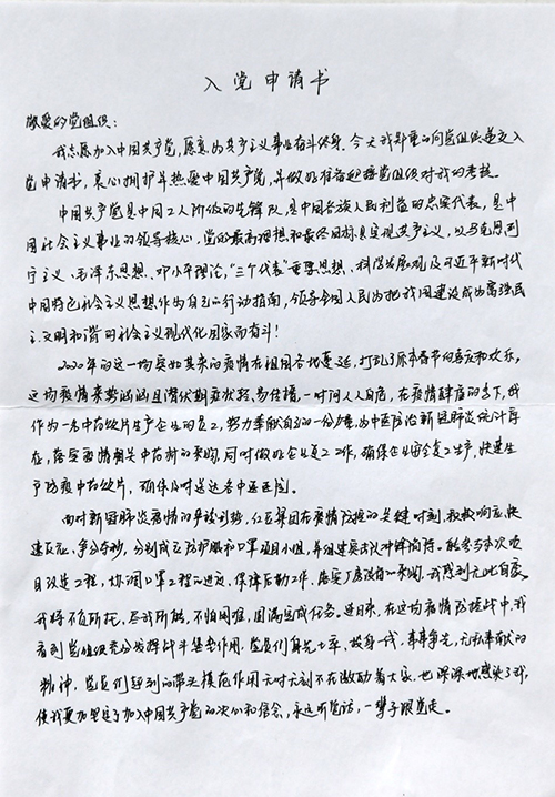 紅豆集團國際公司的員工梁艷的再次向黨組織遞交入黨申請書的原因很簡單,“為了支持一線疫情防控,集團緊急組建黨員突擊隊支援防護服、口罩生產線,負責最緊急、最艱苦的工作。我也報名了,因我還不是黨員,所以沒有把最重的任務安排給我。”受到身邊黨員的激勵,讓梁艷鼓起勇氣,擬出了這份“疫情火線入黨申請書”。