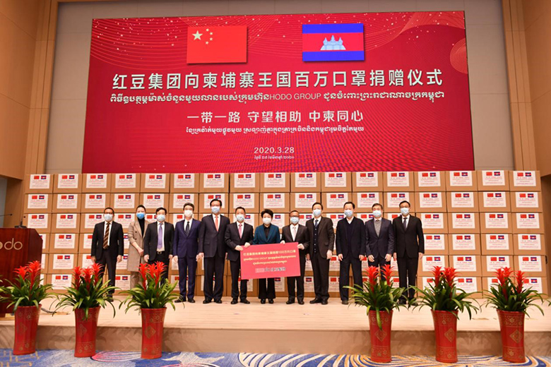 隨著疫情在全球蔓延,我第一時間安排人員向韓國、日本、加拿大、波蘭等海外客戶郵寄口罩,在市委組織部的牽頭下,紅豆還給美、日、韓海外學子捐贈防護口罩。我特別關注柬埔寨的疫情,因為那里有我們打造的西哈努克港經濟特區。得知他們非常缺口罩的時候,我立馬協調生產,加班加點趕制,向柬埔寨紅十字會捐贈了一百萬只口罩。柬埔寨紅十字會主席、洪森首相夫人文拉尼親王特別來信感謝,稱贊“守望相助,中柬同心”。