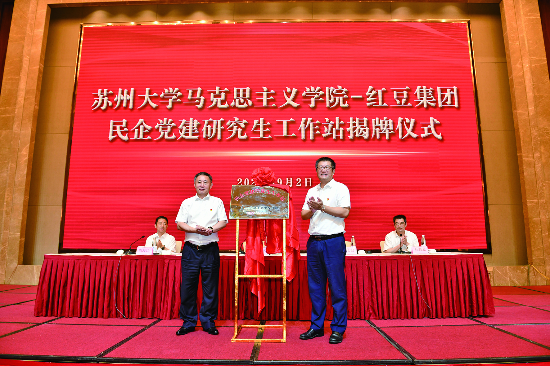 9月2日,無錫市“兩新”組織黨組織書記示范培訓班在紅豆集團開班。開班式上,蘇州大學馬克思主義學院—紅豆集團民企黨建研究生工作站揭牌成立,無錫市委常委、組織部部長柏長嶺和蘇州大學馬克思主義學院院長田芝健共同揭牌。